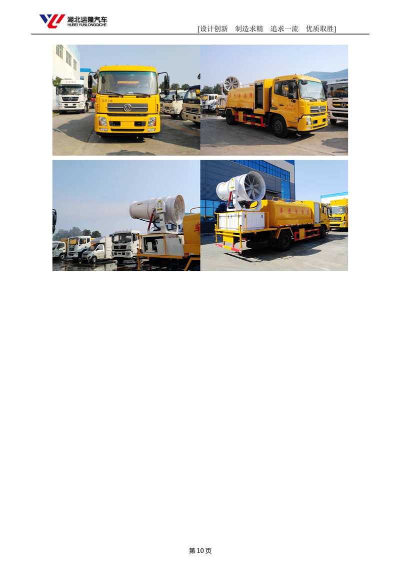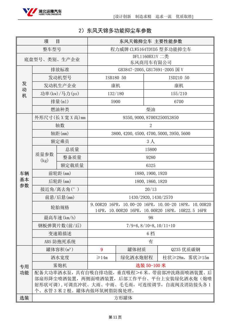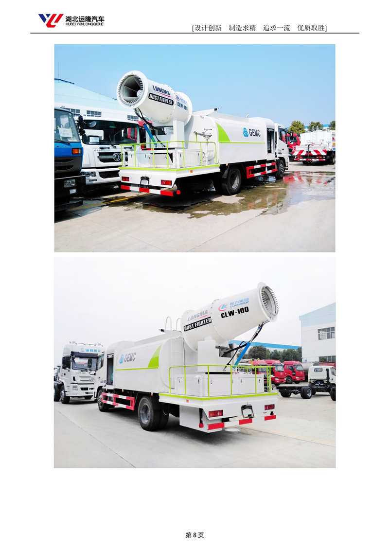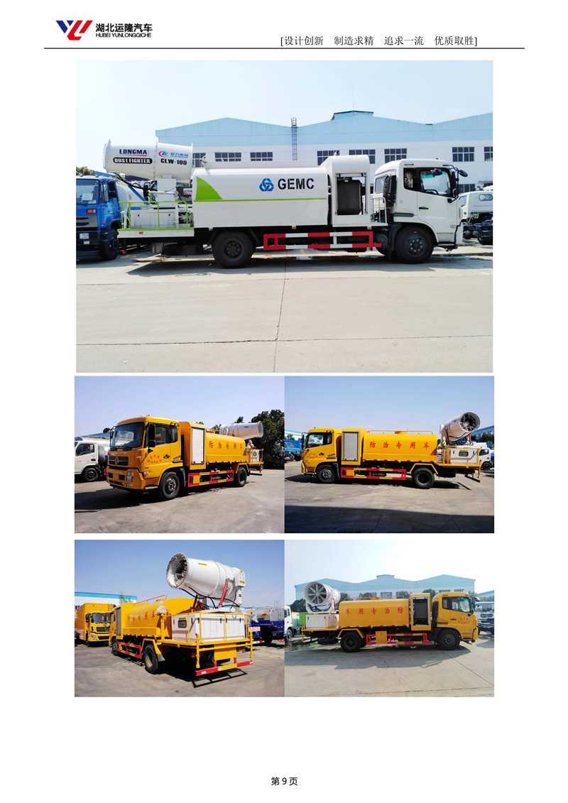 上裝配置:罐體容積為 10-12 立方多功能抑塵灑水車,選配風送式霧炮機組射程50米、60米、80米,罐體鋼板為4mm碳鋼Q235材質,罐內隔板具有防波作用,以減輕汽車行駛時罐體液體沖擊,罐體及整車外形尺寸按照公告。帶大功率專用灑水泵,泵可自吸自排,整車前沖、后灑、側噴、帶65消防接口,后平臺配CLW-50、CLW-60、CLW-80型風送式霧炮機組;罐體前封頭配大功率柴油發電機組;遠程遙控系統控制;霧炮自動旋轉角度0-360°。后平臺帶綠化灑水炮,灑水炮可全方位旋轉,可連續調成直沖狀、大雨、小雨、毛毛雨;前封頭帶水位計,后平臺主管路帶1寸澆花接口,后爬梯。帶兩根輸水管及陰陽端。罐體顏色:白/蘭,罐體兩側噴“多功能抑塵車”字樣,貼反光標示。